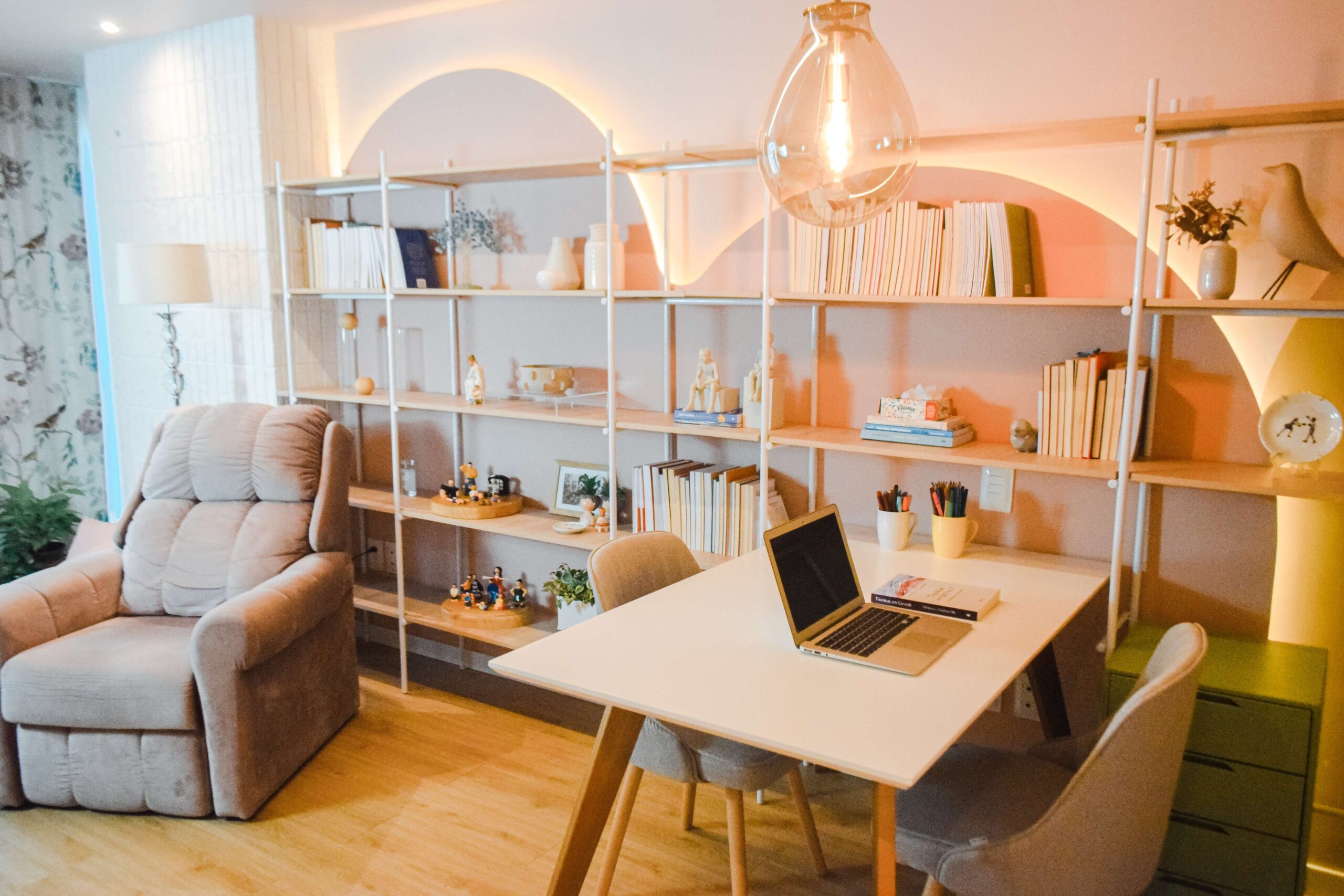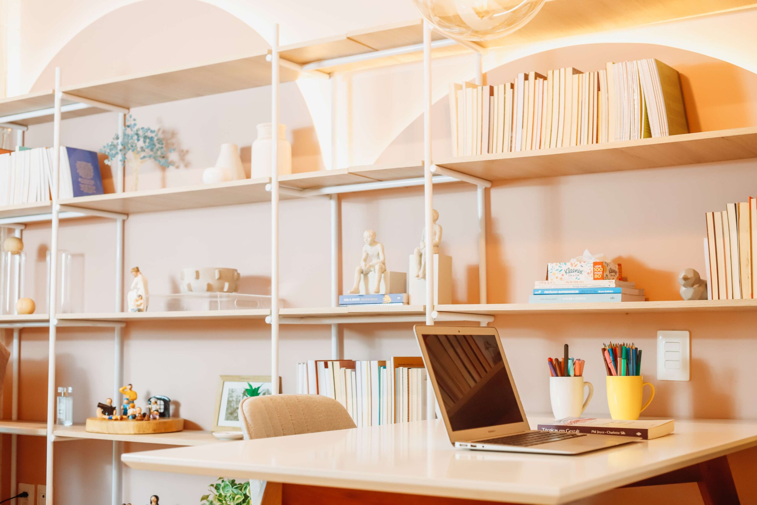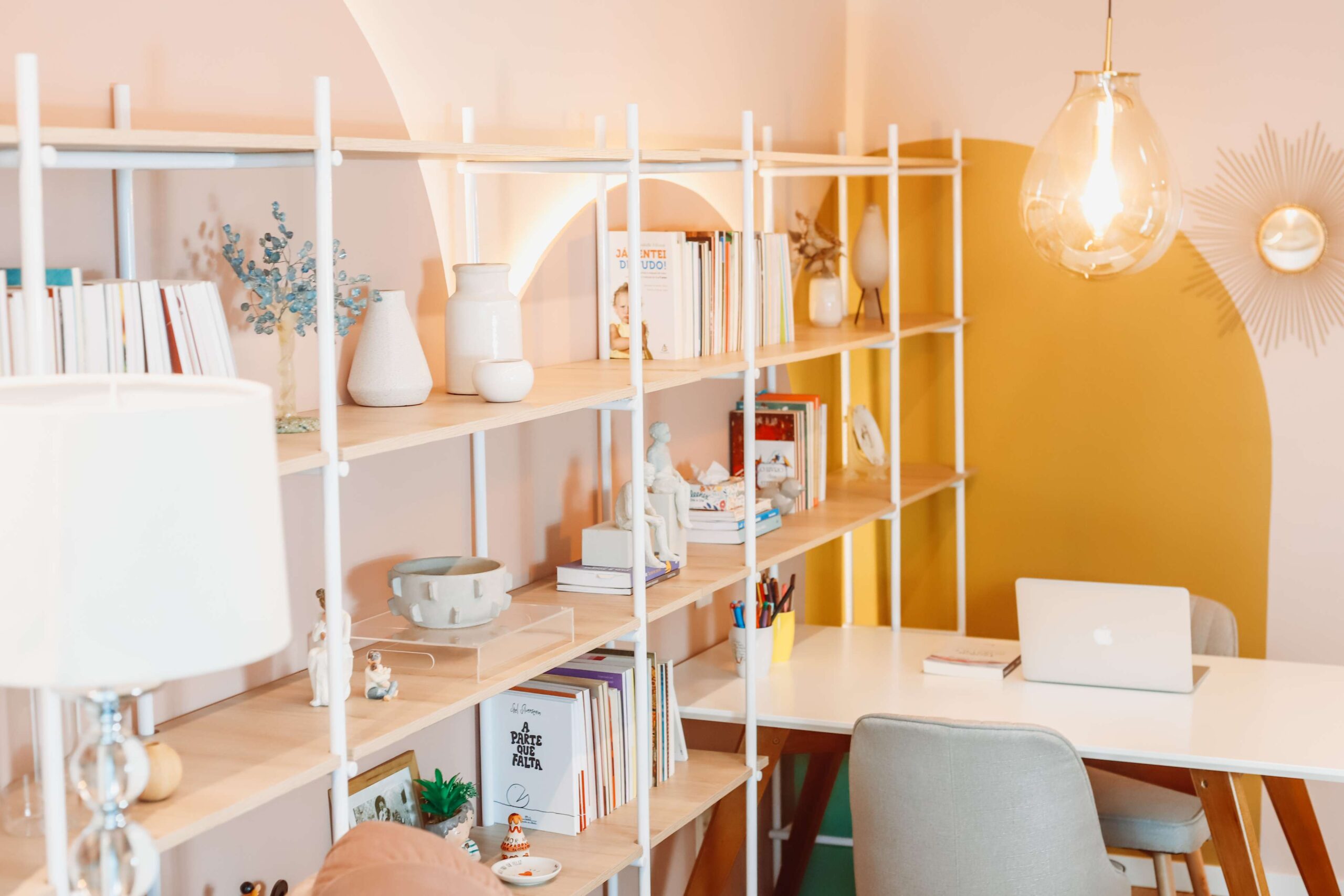 Dentro do consultório, uma grande estante planejada para os muitos livros das psicólogas,